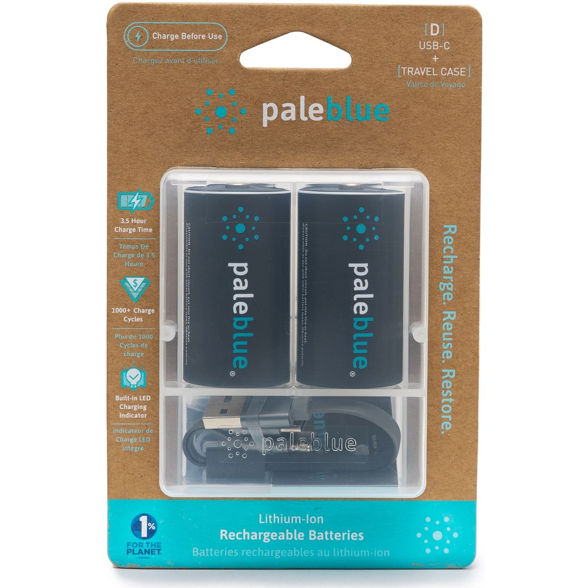 Pale Blue Li-ion Rechargeable D Battery 2 Pack Of Dcells w/ 2×1 USB-C Cable